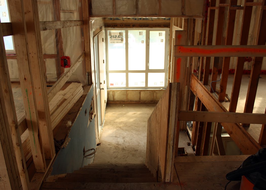The interior at this point was drywall-ready. Here is the font entry addition from the top of the stairs.