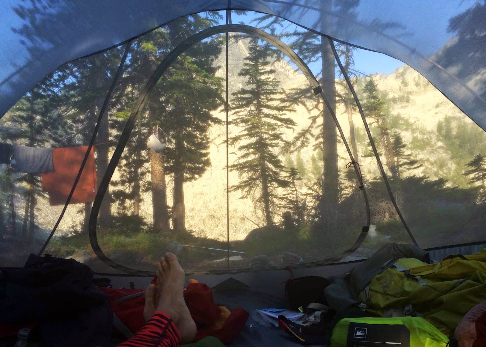 Day two, we hiked a couple kilometers over to Middle Oval Lake, where we set up camp again before heading up to Oval Peak. Our camp was at 6800ft and the peak was 8795ft and it was a few clicks away, but we never really got a good calculation of how far we went. It was quite memorable, though, since we had just climbed to the exposed ridge when a rather intense lightning storm hit us and we had to squat in a small shelter of overhanging rocks for over an hour, covering our ears from the volume of thunder. Very cool. And the peak, of course, had spectacular views, including towards the hazy orange glow of fires to the south.